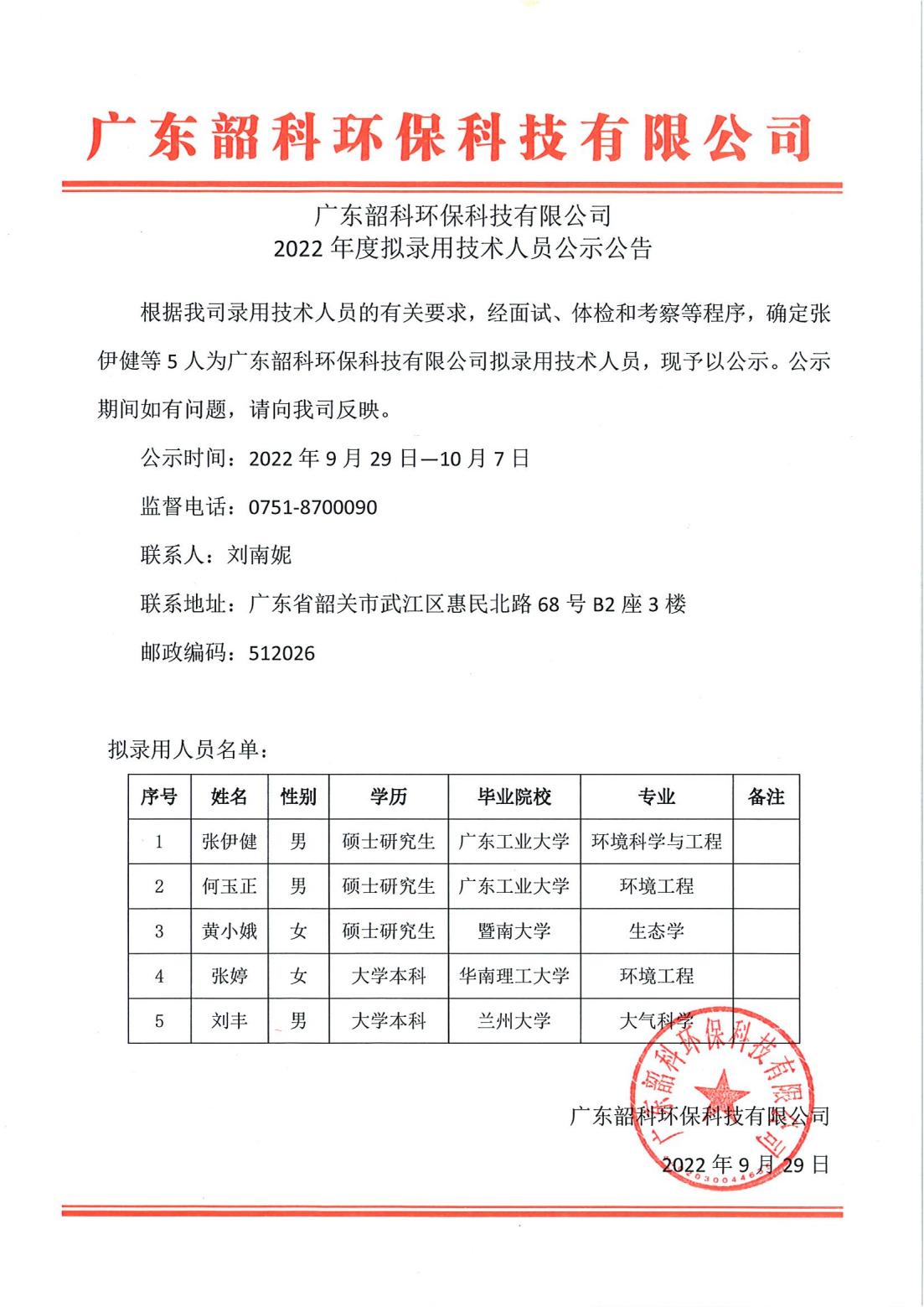 根據(jù)我司錄用技術人員的有關要求,經(jīng)面試、體檢和考察等程序,確定張伊健等5人為廣東韶科環(huán)保科技有限公司擬錄用技術人員,現(xiàn)予以公示。公示期間如有問題,請向我司反映。