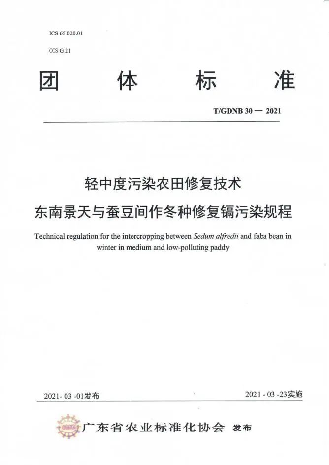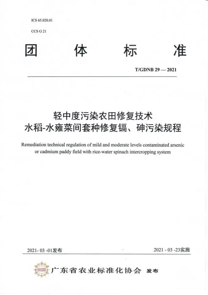 【CONGRATULATION】 喜 報(bào) 熱烈祝賀 我司參與制定的標(biāo)準(zhǔn) 頒布實(shí)施 我司與華南農(nóng)業(yè)大學(xué)資源環(huán)境學(xué)院、中國科學(xué)院地理科學(xué)與資源研究所等單位合作開展高低累積水稻品種間作修復(fù)鎘污染,水稻-水雍菜間套種修復(fù)鎘、砷污染,東南景天與蠶豆間作冬種修復(fù)鎘污染等研究工作,聯(lián)合起草了《輕中度污染農(nóng)田修復(fù)技術(shù) 高低累積水稻品種間作修復(fù)鎘污染規(guī)程》(T/GDNB28-2021)、《輕中度污染農(nóng)田修復(fù)技術(shù) 水稻-水雍菜間套種修復(fù)鎘、砷污染規(guī)程》(T/GDNB29-2021)、《輕中度污染農(nóng)田修復(fù)技術(shù) 東南景天與蠶豆間作冬種修復(fù)鎘污染規(guī)程》(T/GDNB30-2021),通過廣東省農(nóng)業(yè)標(biāo)準(zhǔn)化協(xié)會(huì)組織的標(biāo)準(zhǔn)審定并發(fā)布實(shí)施(2021年3月23日實(shí)施)。 廣東韶科環(huán)保科技有限公司 20121年4月9日